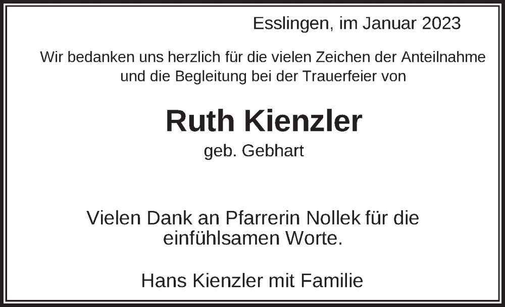 Hier finden Sie alle Traueranzeigen aus der Zeitung, die bisher für Ruth Kienzler erschienen sind. Weitere Traueranzeigen, die in der Zeitung erscheinen, werden hier ebenfalls aufgelistet