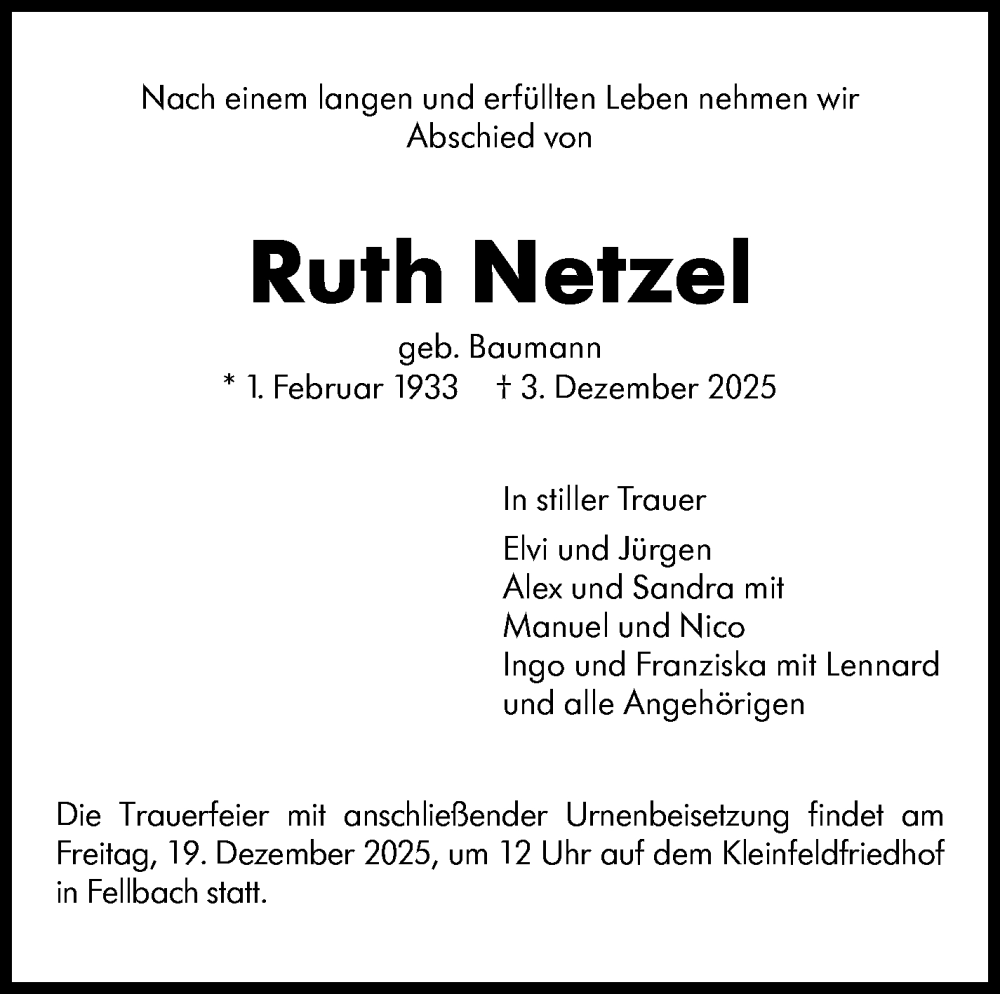 Hier finden Sie alle Traueranzeigen aus der Zeitung, die bisher für Ruth Netzel erschienen sind. Weitere Traueranzeigen, die in der Zeitung erscheinen, werden hier ebenfalls aufgelistet