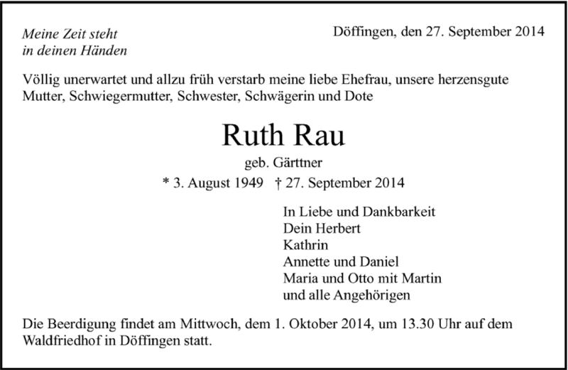 Hier finden Sie alle Traueranzeigen aus der Zeitung, die bisher für Ruth Rau erschienen sind. Weitere Traueranzeigen, die in der Zeitung erscheinen, werden hier ebenfalls aufgelistet