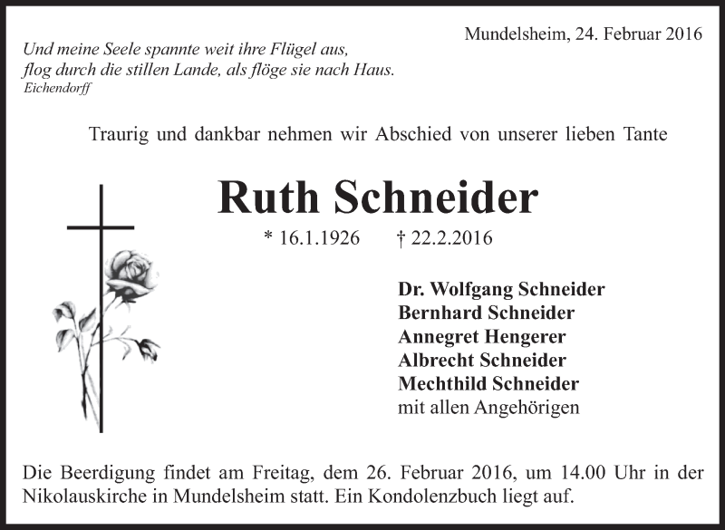 Hier finden Sie alle Traueranzeigen aus der Zeitung, die bisher für Ruth Schneider erschienen sind. Weitere Traueranzeigen, die in der Zeitung erscheinen, werden hier ebenfalls aufgelistet