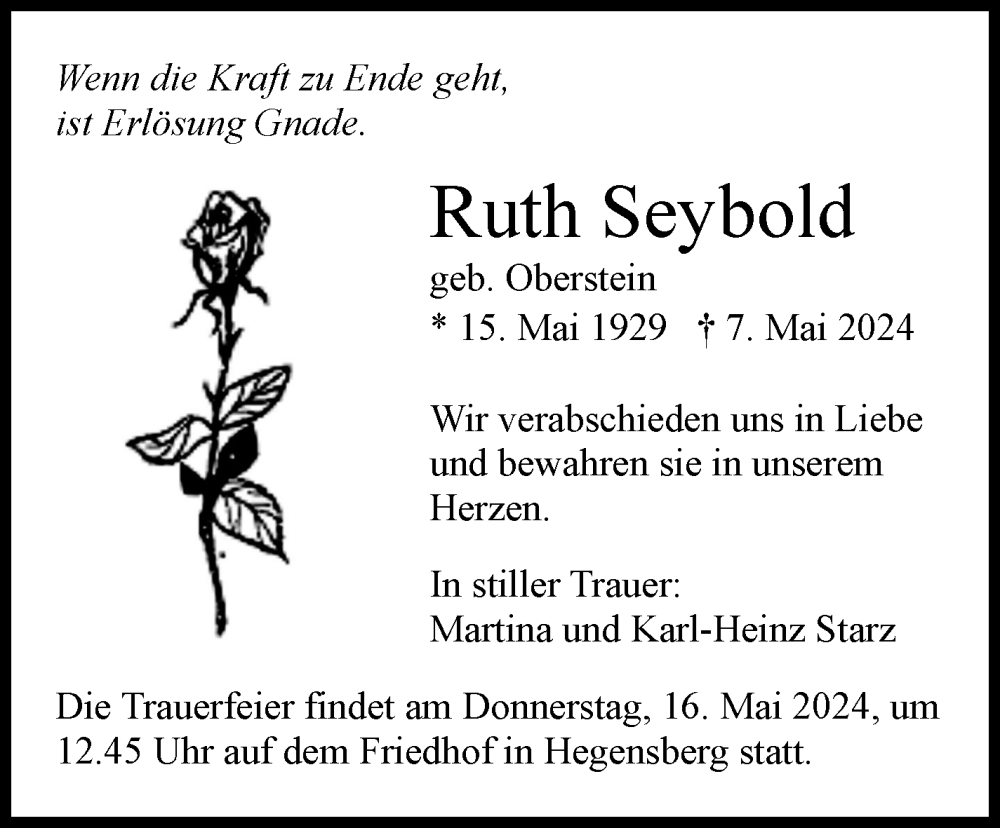 Hier finden Sie alle Traueranzeigen aus der Zeitung, die bisher für Ruth Seybold erschienen sind. Weitere Traueranzeigen, die in der Zeitung erscheinen, werden hier ebenfalls aufgelistet