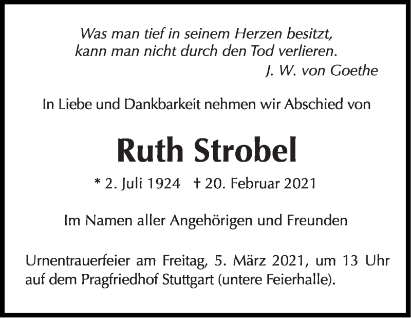 Hier finden Sie alle Traueranzeigen aus der Zeitung, die bisher für Ruth Strobel erschienen sind. Weitere Traueranzeigen, die in der Zeitung erscheinen, werden hier ebenfalls aufgelistet