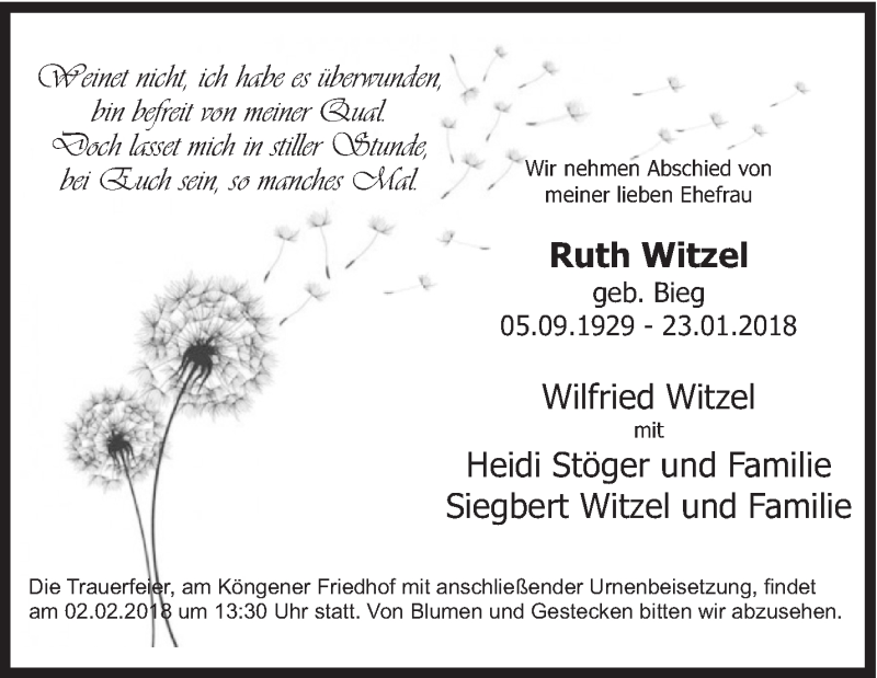 Hier finden Sie alle Traueranzeigen aus der Zeitung, die bisher für Ruth Witzel erschienen sind. Weitere Traueranzeigen, die in der Zeitung erscheinen, werden hier ebenfalls aufgelistet