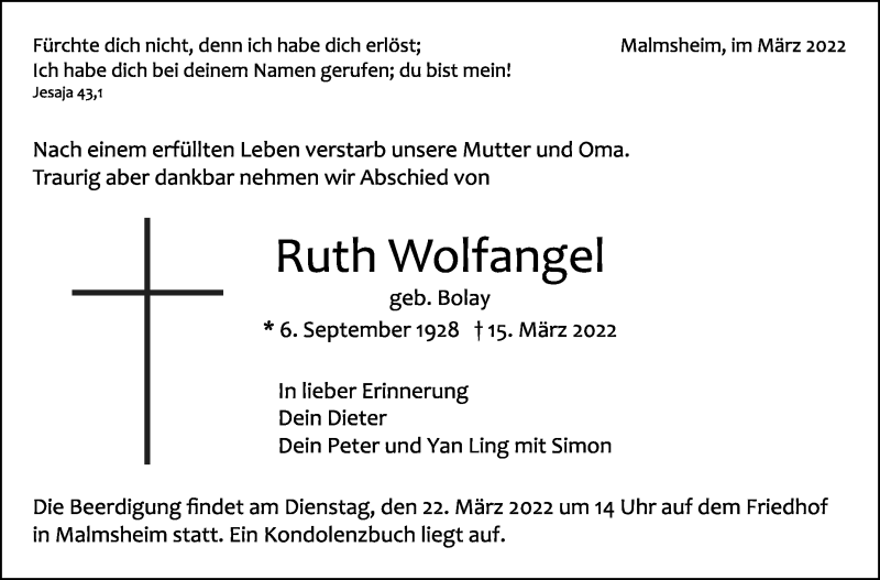 Hier finden Sie alle Traueranzeigen aus der Zeitung, die bisher für Ruth Wolfangel erschienen sind. Weitere Traueranzeigen, die in der Zeitung erscheinen, werden hier ebenfalls aufgelistet
