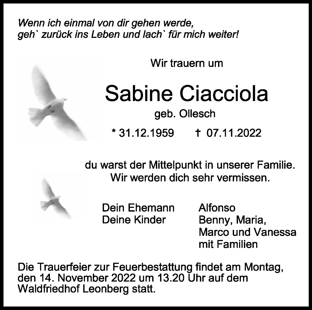 Hier finden Sie alle Traueranzeigen aus der Zeitung, die bisher für Sabine Ciacciola erschienen sind. Weitere Traueranzeigen, die in der Zeitung erscheinen, werden hier ebenfalls aufgelistet