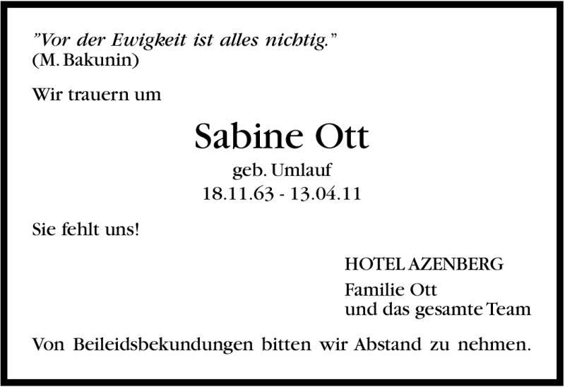 Hier finden Sie alle Traueranzeigen aus der Zeitung, die bisher für Sabine Ott erschienen sind. Weitere Traueranzeigen, die in der Zeitung erscheinen, werden hier ebenfalls aufgelistet