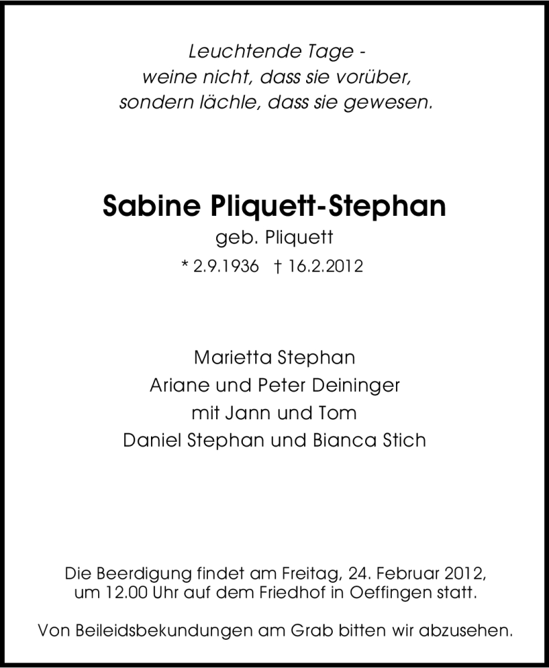 Hier finden Sie alle Traueranzeigen aus der Zeitung, die bisher für Sabine Pliquett-Stephan erschienen sind. Weitere Traueranzeigen, die in der Zeitung erscheinen, werden hier ebenfalls aufgelistet