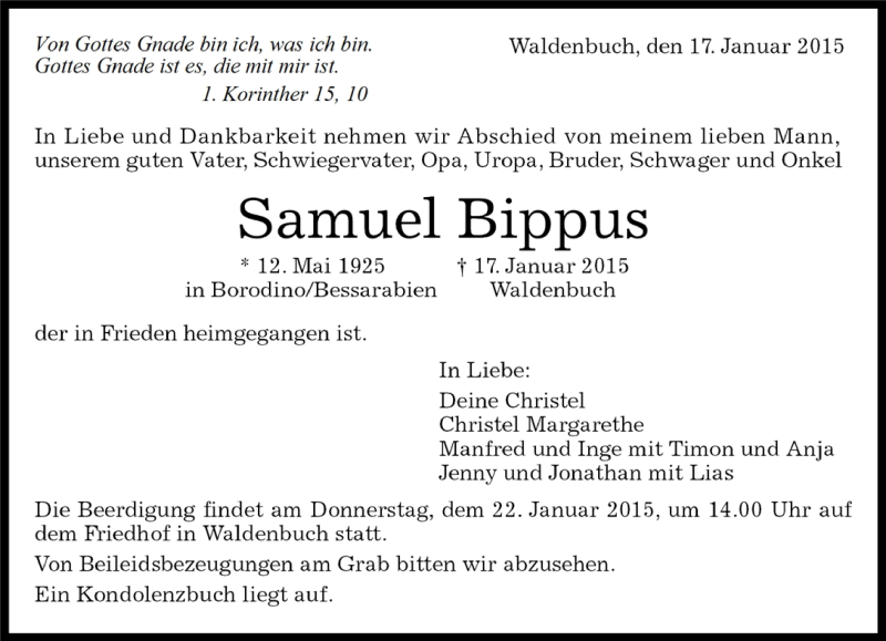 Hier finden Sie alle Traueranzeigen aus der Zeitung, die bisher für Samuel Bippus erschienen sind. Weitere Traueranzeigen, die in der Zeitung erscheinen, werden hier ebenfalls aufgelistet