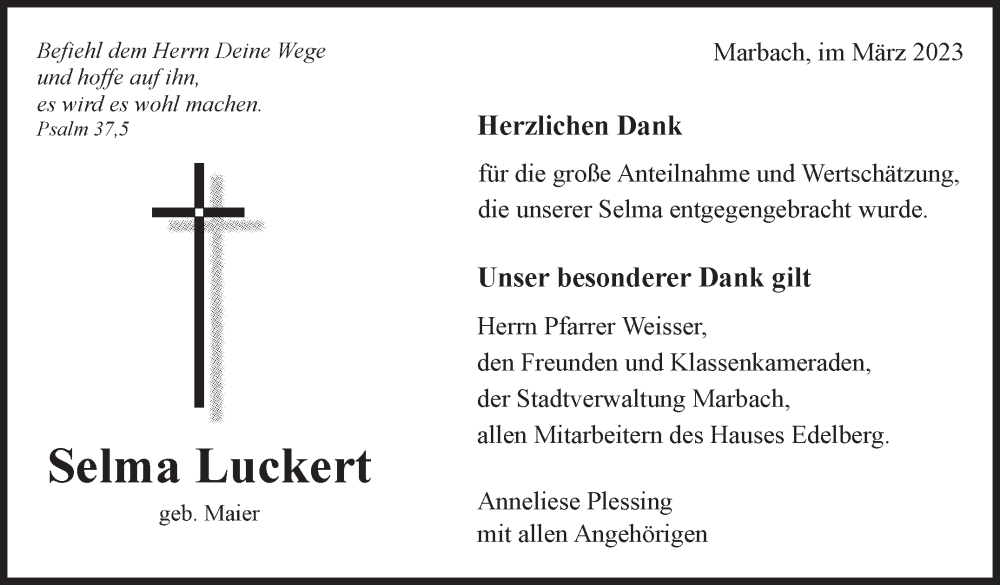 Hier finden Sie alle Traueranzeigen aus der Zeitung, die bisher für Selma Luckert erschienen sind. Weitere Traueranzeigen, die in der Zeitung erscheinen, werden hier ebenfalls aufgelistet