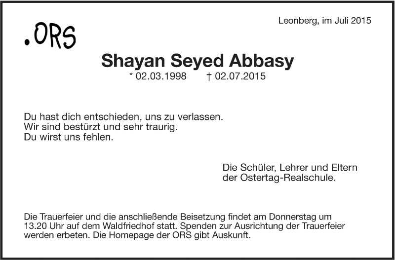Hier finden Sie alle Traueranzeigen aus der Zeitung, die bisher für Shayan Seyed Abbasy erschienen sind. Weitere Traueranzeigen, die in der Zeitung erscheinen, werden hier ebenfalls aufgelistet