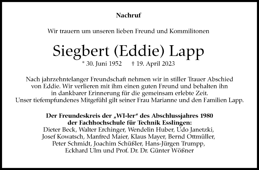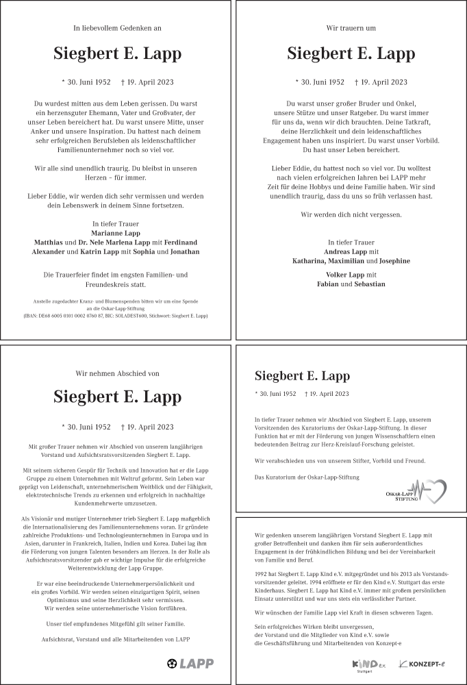 Hier finden Sie alle Traueranzeigen aus der Zeitung, die bisher für Siegbert Lapp erschienen sind. Weitere Traueranzeigen, die in der Zeitung erscheinen, werden hier ebenfalls aufgelistet