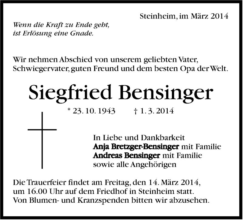 Hier finden Sie alle Traueranzeigen aus der Zeitung, die bisher für Siegfried Bensinger erschienen sind. Weitere Traueranzeigen, die in der Zeitung erscheinen, werden hier ebenfalls aufgelistet