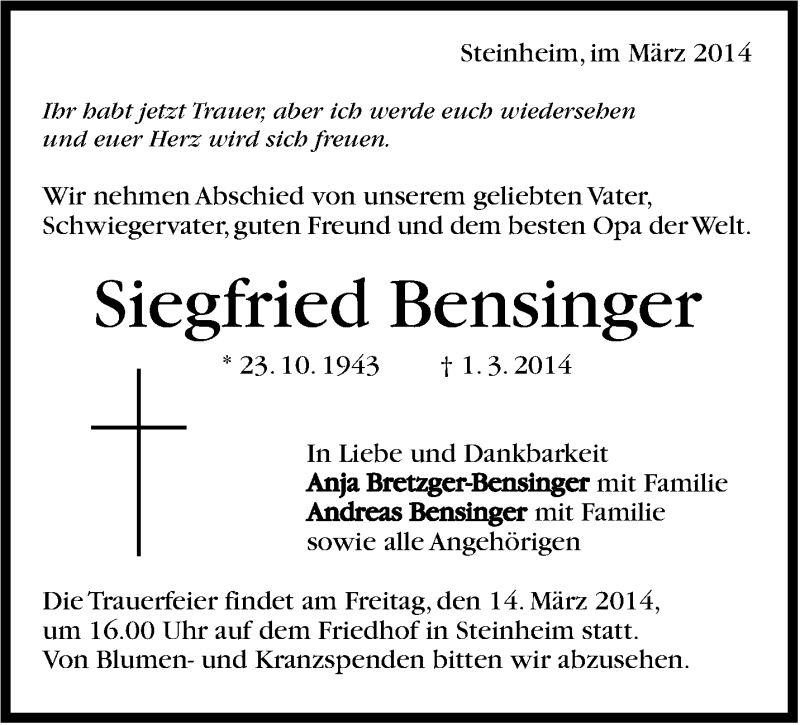 Hier finden Sie alle Traueranzeigen aus der Zeitung, die bisher für Siegfried Bensinger erschienen sind. Weitere Traueranzeigen, die in der Zeitung erscheinen, werden hier ebenfalls aufgelistet
