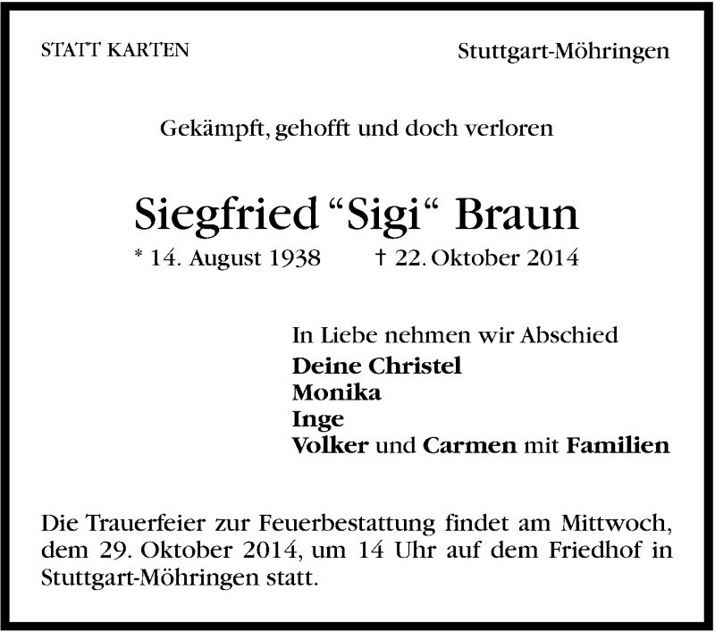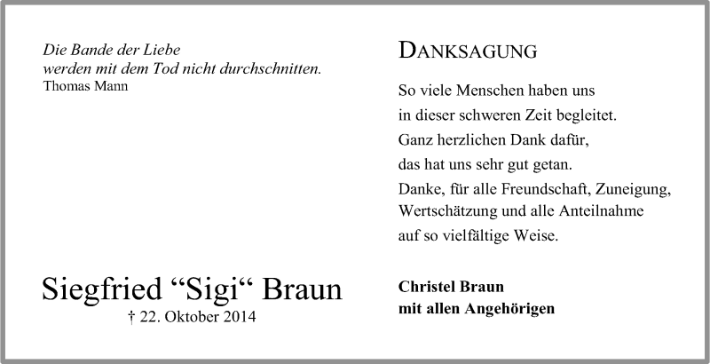 Hier finden Sie alle Traueranzeigen aus der Zeitung, die bisher für Siegfried Braun erschienen sind. Weitere Traueranzeigen, die in der Zeitung erscheinen, werden hier ebenfalls aufgelistet