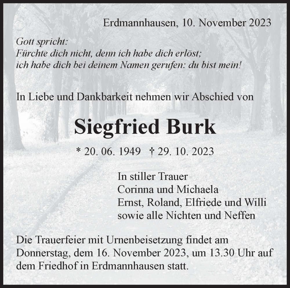 Hier finden Sie alle Traueranzeigen aus der Zeitung, die bisher für Siegfried Burk erschienen sind. Weitere Traueranzeigen, die in der Zeitung erscheinen, werden hier ebenfalls aufgelistet