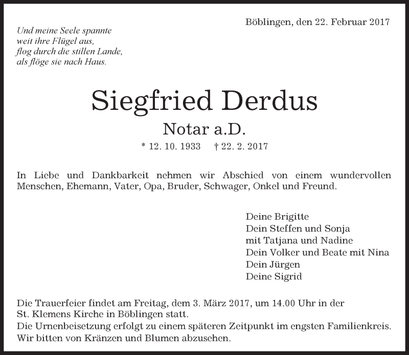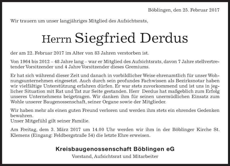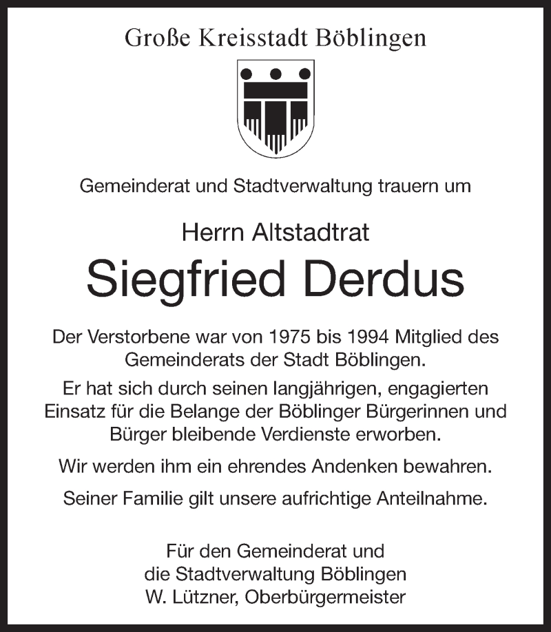 Hier finden Sie alle Traueranzeigen aus der Zeitung, die bisher für Siegfried Derdus erschienen sind. Weitere Traueranzeigen, die in der Zeitung erscheinen, werden hier ebenfalls aufgelistet