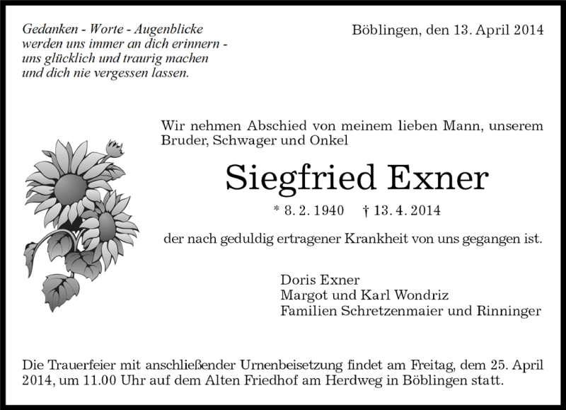 Hier finden Sie alle Traueranzeigen aus der Zeitung, die bisher für Siegfried Exner erschienen sind. Weitere Traueranzeigen, die in der Zeitung erscheinen, werden hier ebenfalls aufgelistet