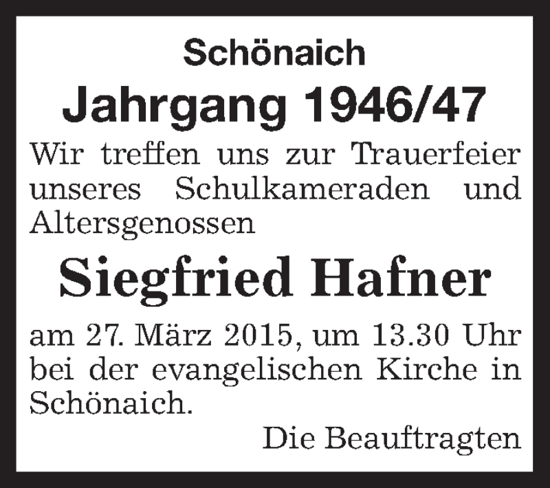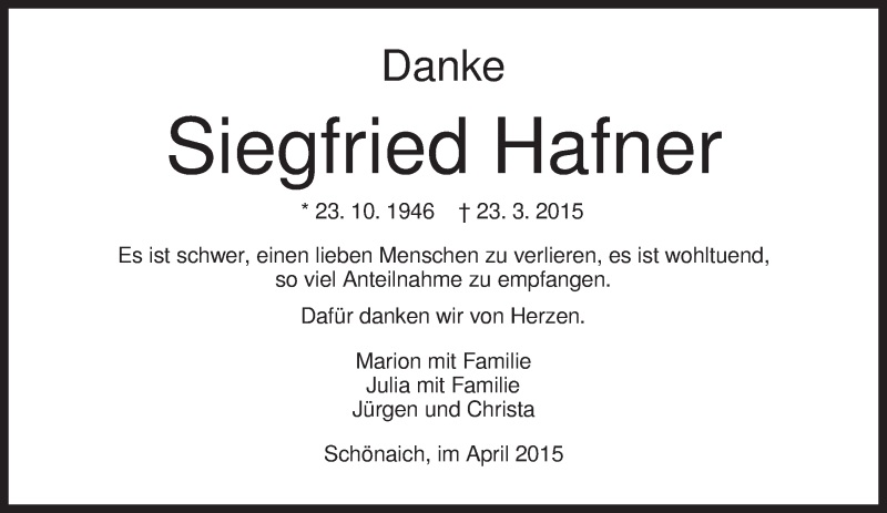 Hier finden Sie alle Traueranzeigen aus der Zeitung, die bisher für Siegfried Hafner erschienen sind. Weitere Traueranzeigen, die in der Zeitung erscheinen, werden hier ebenfalls aufgelistet