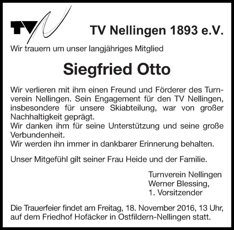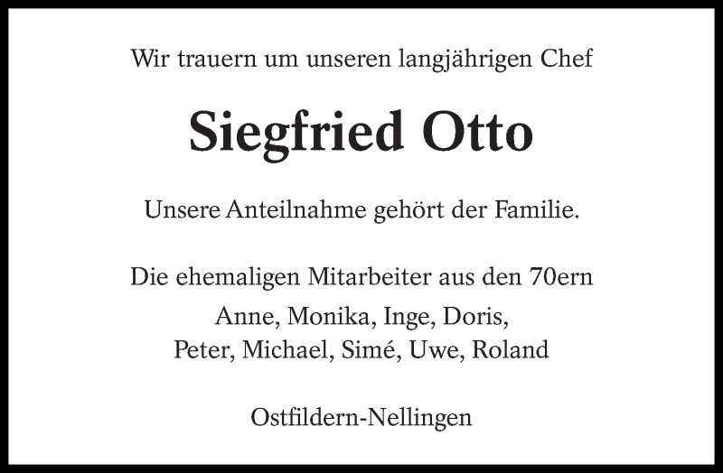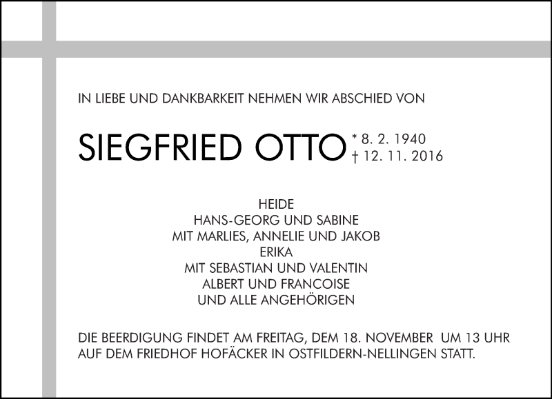Hier finden Sie alle Traueranzeigen aus der Zeitung, die bisher für Siegfried Otto erschienen sind. Weitere Traueranzeigen, die in der Zeitung erscheinen, werden hier ebenfalls aufgelistet