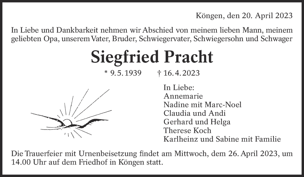 Hier finden Sie alle Traueranzeigen aus der Zeitung, die bisher für Siegfried Pracht erschienen sind. Weitere Traueranzeigen, die in der Zeitung erscheinen, werden hier ebenfalls aufgelistet