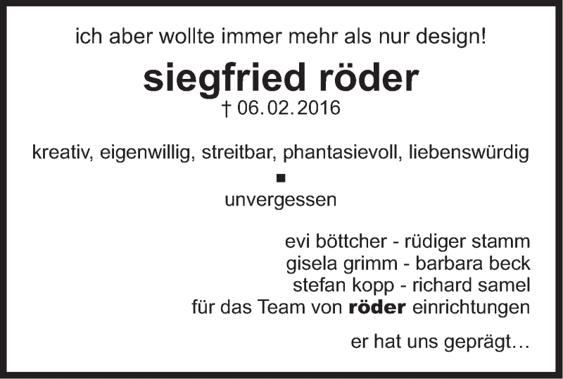 Hier finden Sie alle Traueranzeigen aus der Zeitung, die bisher für Siegfried Röder erschienen sind. Weitere Traueranzeigen, die in der Zeitung erscheinen, werden hier ebenfalls aufgelistet