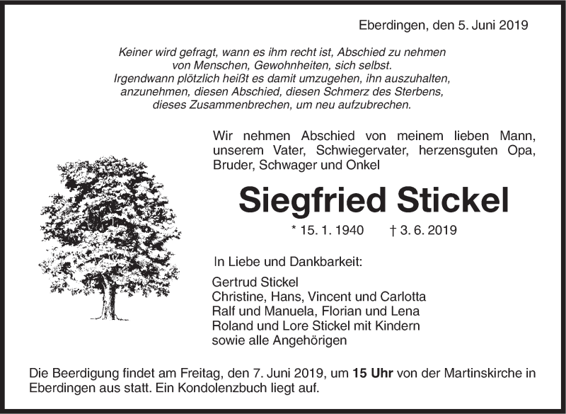 Hier finden Sie alle Traueranzeigen aus der Zeitung, die bisher für Siegfried Stickel erschienen sind. Weitere Traueranzeigen, die in der Zeitung erscheinen, werden hier ebenfalls aufgelistet