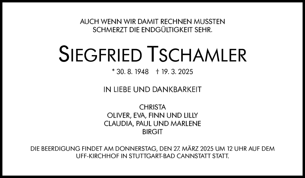Hier finden Sie alle Traueranzeigen aus der Zeitung, die bisher für Siegfried Tschamler erschienen sind. Weitere Traueranzeigen, die in der Zeitung erscheinen, werden hier ebenfalls aufgelistet