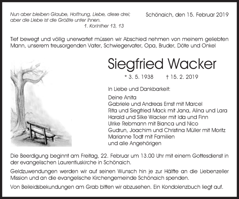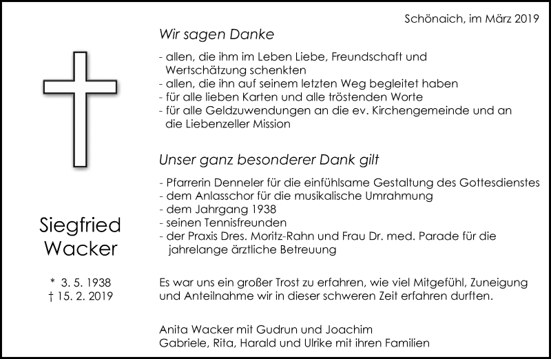 Hier finden Sie alle Traueranzeigen aus der Zeitung, die bisher für Siegfried Wacker erschienen sind. Weitere Traueranzeigen, die in der Zeitung erscheinen, werden hier ebenfalls aufgelistet