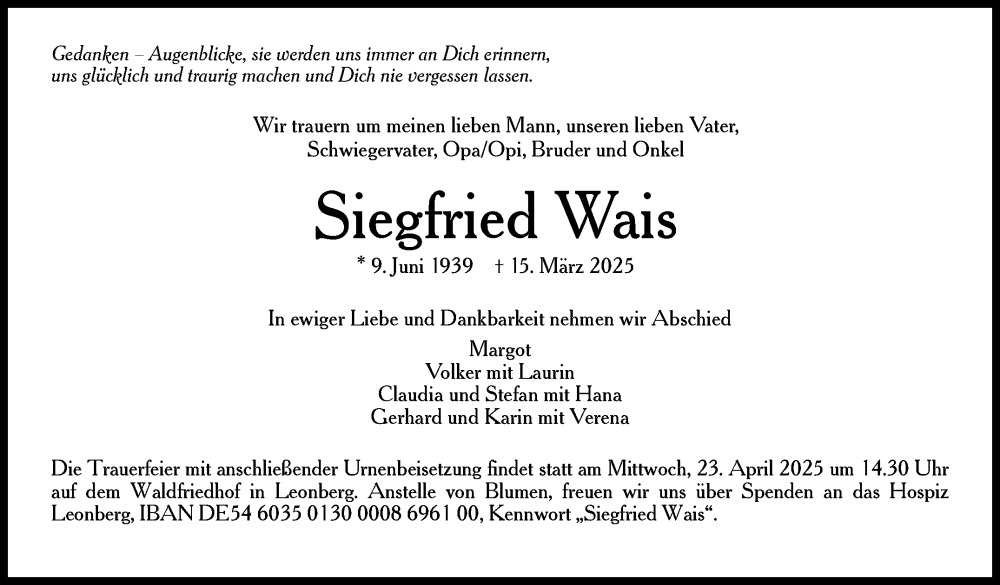 Hier finden Sie alle Traueranzeigen aus der Zeitung, die bisher für Siegfried Wais erschienen sind. Weitere Traueranzeigen, die in der Zeitung erscheinen, werden hier ebenfalls aufgelistet