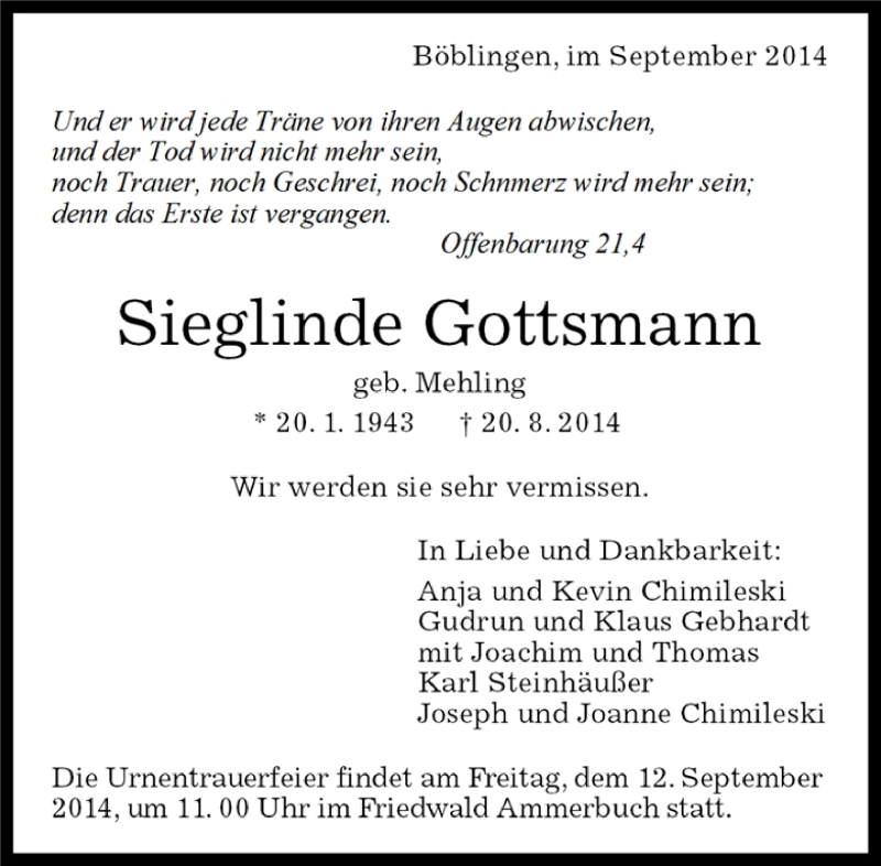 Hier finden Sie alle Traueranzeigen aus der Zeitung, die bisher für Sieglinde Gottsmann erschienen sind. Weitere Traueranzeigen, die in der Zeitung erscheinen, werden hier ebenfalls aufgelistet