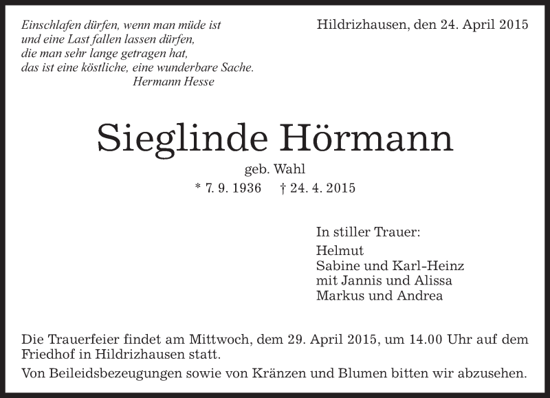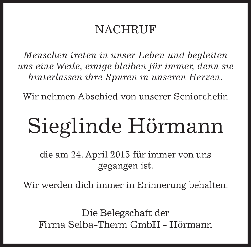 Hier finden Sie alle Traueranzeigen aus der Zeitung, die bisher für Sieglinde Hörmann erschienen sind. Weitere Traueranzeigen, die in der Zeitung erscheinen, werden hier ebenfalls aufgelistet