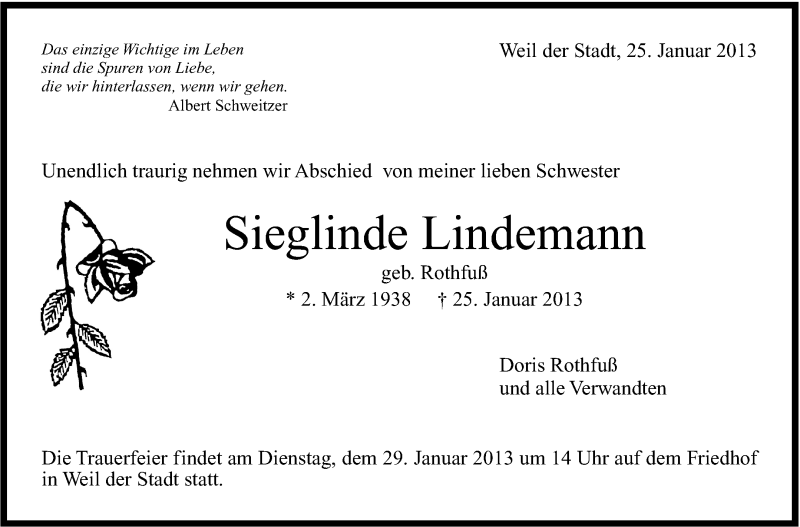 Hier finden Sie alle Traueranzeigen aus der Zeitung, die bisher für Sieglinde Lindemann erschienen sind. Weitere Traueranzeigen, die in der Zeitung erscheinen, werden hier ebenfalls aufgelistet