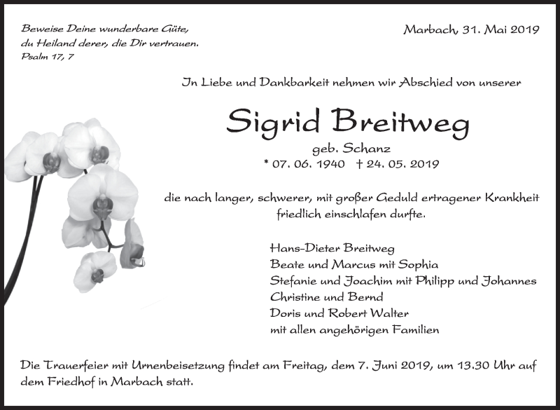 Hier finden Sie alle Traueranzeigen aus der Zeitung, die bisher für Sigrid Breitweg erschienen sind. Weitere Traueranzeigen, die in der Zeitung erscheinen, werden hier ebenfalls aufgelistet