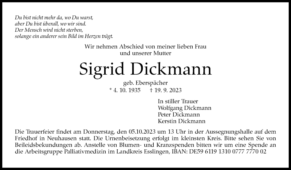 Hier finden Sie alle Traueranzeigen aus der Zeitung, die bisher für Sigrid Dickmann erschienen sind. Weitere Traueranzeigen, die in der Zeitung erscheinen, werden hier ebenfalls aufgelistet