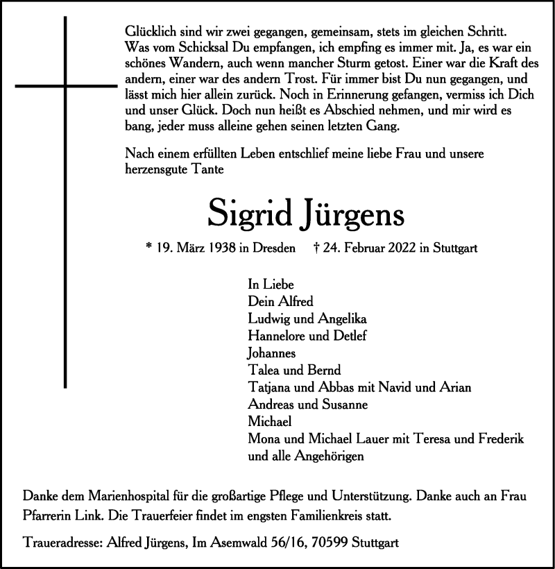 Hier finden Sie alle Traueranzeigen aus der Zeitung, die bisher für Sigrid Jürgens erschienen sind. Weitere Traueranzeigen, die in der Zeitung erscheinen, werden hier ebenfalls aufgelistet