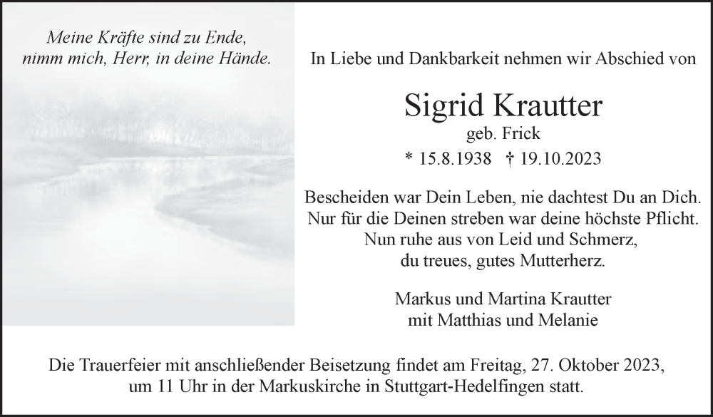 Hier finden Sie alle Traueranzeigen aus der Zeitung, die bisher für Sigrid Krautter erschienen sind. Weitere Traueranzeigen, die in der Zeitung erscheinen, werden hier ebenfalls aufgelistet