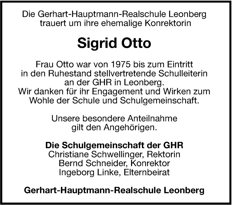 Hier finden Sie alle Traueranzeigen aus der Zeitung, die bisher für Sigrid Otto erschienen sind. Weitere Traueranzeigen, die in der Zeitung erscheinen, werden hier ebenfalls aufgelistet