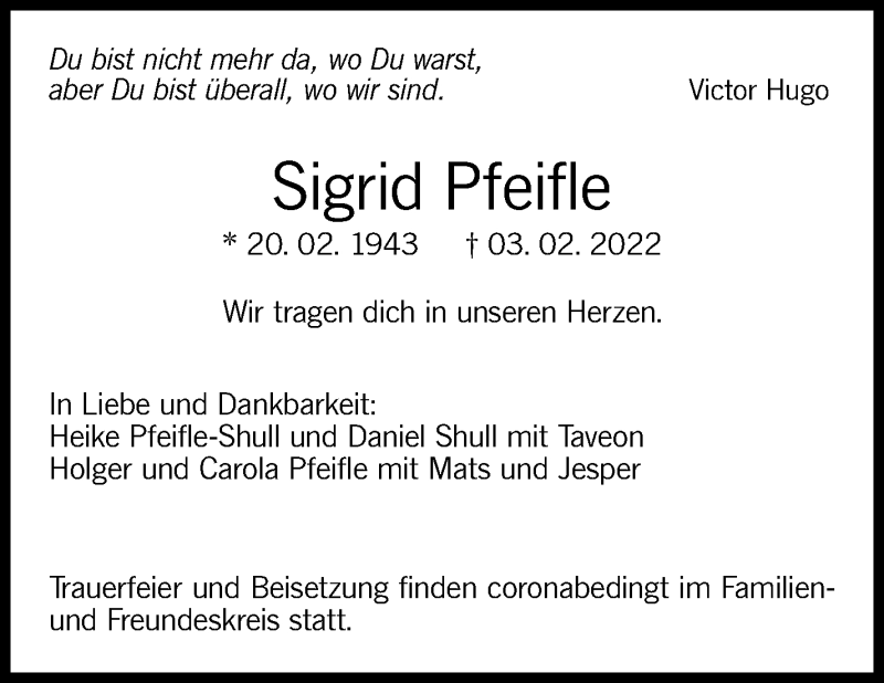 Hier finden Sie alle Traueranzeigen aus der Zeitung, die bisher für Sigrid Pfeifle erschienen sind. Weitere Traueranzeigen, die in der Zeitung erscheinen, werden hier ebenfalls aufgelistet