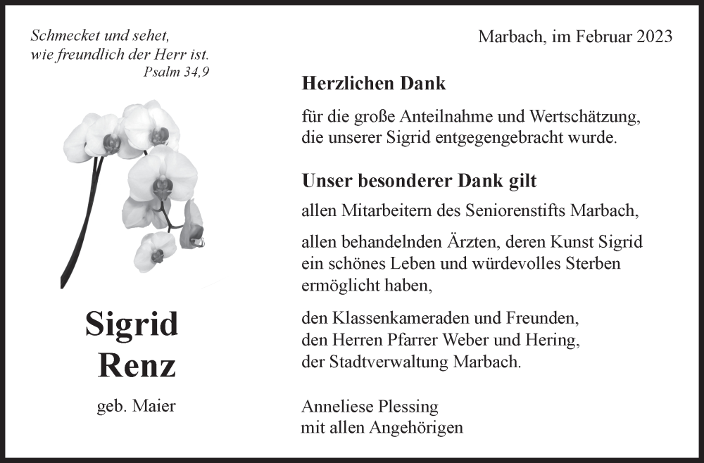 Hier finden Sie alle Traueranzeigen aus der Zeitung, die bisher für Sigrid Renz erschienen sind. Weitere Traueranzeigen, die in der Zeitung erscheinen, werden hier ebenfalls aufgelistet