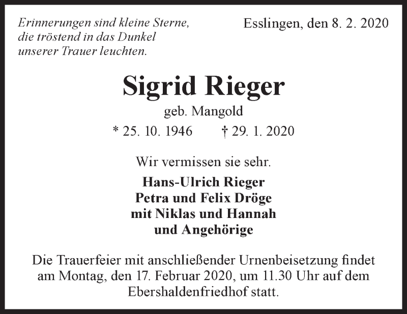 Hier finden Sie alle Traueranzeigen aus der Zeitung, die bisher für Sigrid Rieger erschienen sind. Weitere Traueranzeigen, die in der Zeitung erscheinen, werden hier ebenfalls aufgelistet