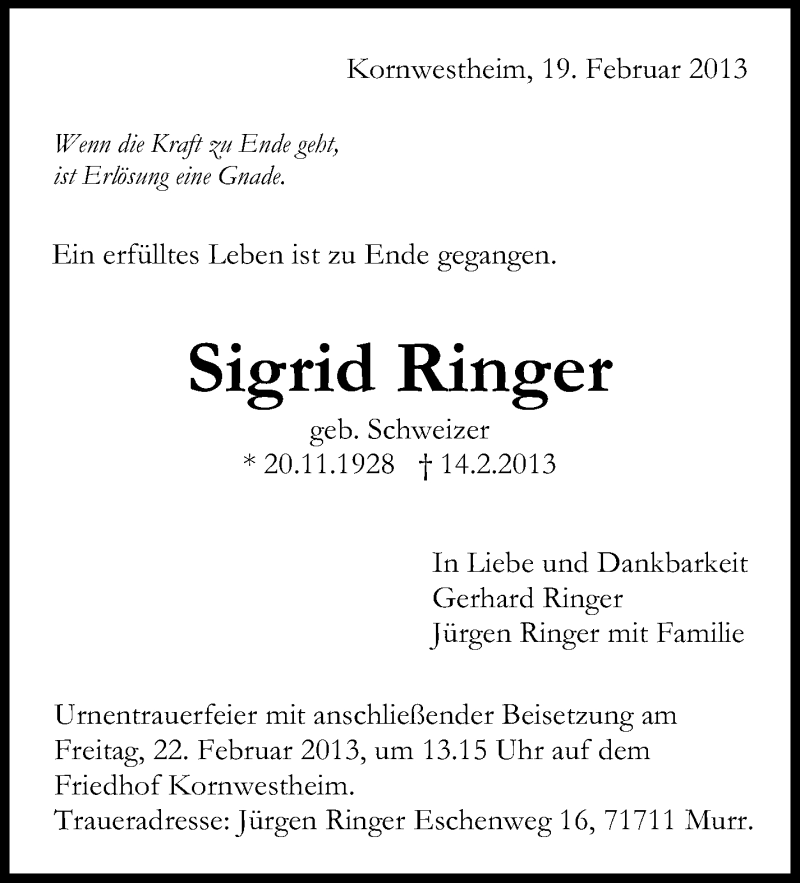 Hier finden Sie alle Traueranzeigen aus der Zeitung, die bisher für Sigrid Ringer erschienen sind. Weitere Traueranzeigen, die in der Zeitung erscheinen, werden hier ebenfalls aufgelistet