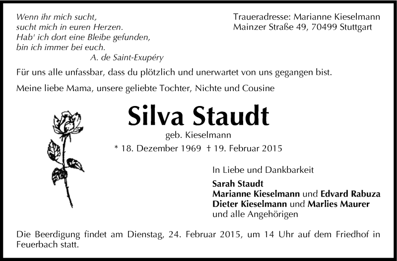 Hier finden Sie alle Traueranzeigen aus der Zeitung, die bisher für Silva Staudt erschienen sind. Weitere Traueranzeigen, die in der Zeitung erscheinen, werden hier ebenfalls aufgelistet