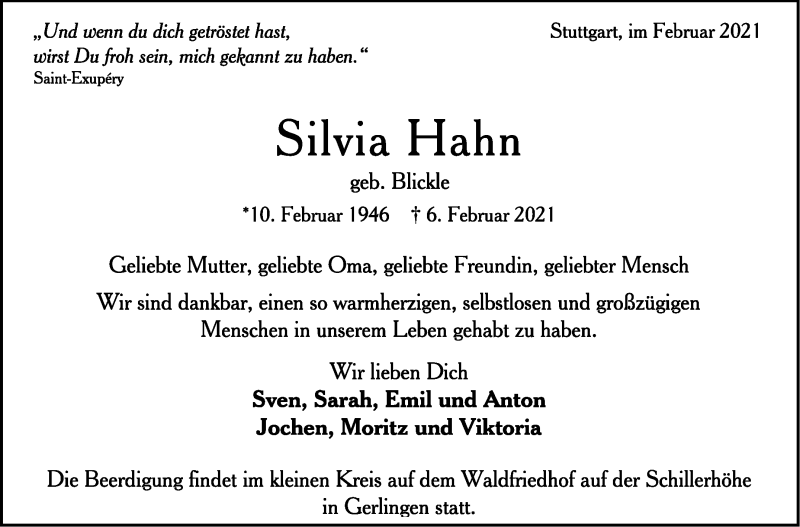 Hier finden Sie alle Traueranzeigen aus der Zeitung, die bisher für Silvia Hahn erschienen sind. Weitere Traueranzeigen, die in der Zeitung erscheinen, werden hier ebenfalls aufgelistet