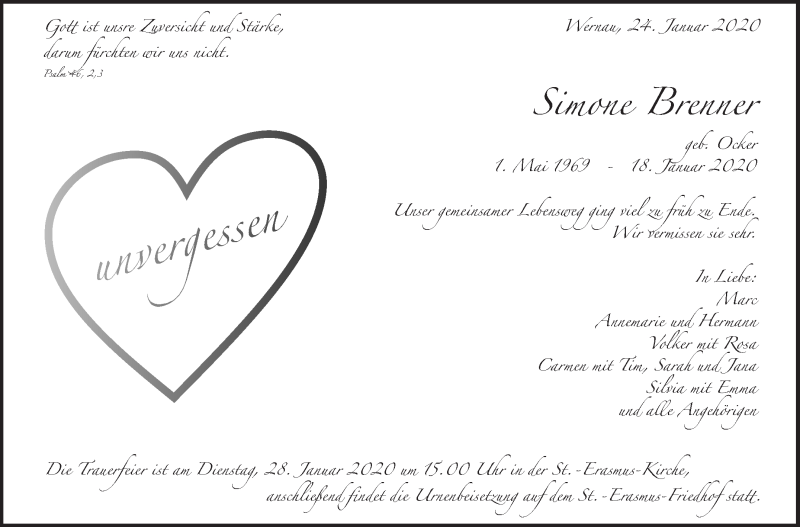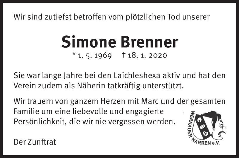 Hier finden Sie alle Traueranzeigen aus der Zeitung, die bisher für Simone Brenner erschienen sind. Weitere Traueranzeigen, die in der Zeitung erscheinen, werden hier ebenfalls aufgelistet