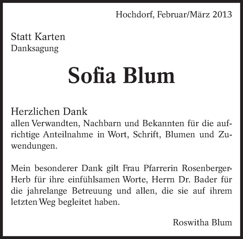 Hier finden Sie alle Traueranzeigen aus der Zeitung, die bisher für Sofia Blum erschienen sind. Weitere Traueranzeigen, die in der Zeitung erscheinen, werden hier ebenfalls aufgelistet
