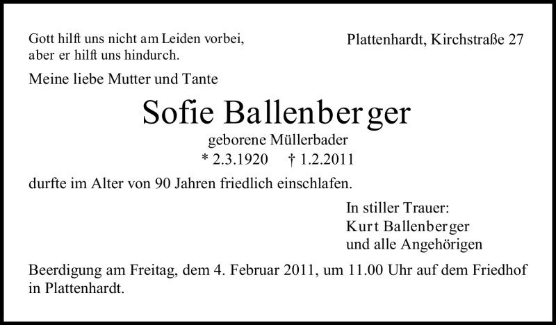 Hier finden Sie alle Traueranzeigen aus der Zeitung, die bisher für Sofie Ballenberger erschienen sind. Weitere Traueranzeigen, die in der Zeitung erscheinen, werden hier ebenfalls aufgelistet