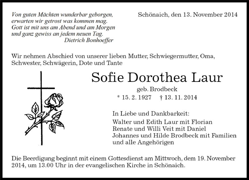 Hier finden Sie alle Traueranzeigen aus der Zeitung, die bisher für Sofie Dorothea Laur erschienen sind. Weitere Traueranzeigen, die in der Zeitung erscheinen, werden hier ebenfalls aufgelistet