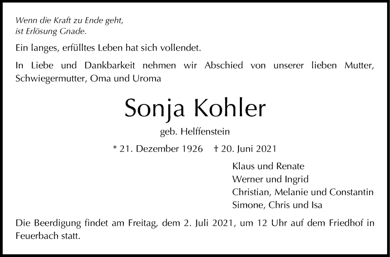 Hier finden Sie alle Traueranzeigen aus der Zeitung, die bisher für Sonja Kohler erschienen sind. Weitere Traueranzeigen, die in der Zeitung erscheinen, werden hier ebenfalls aufgelistet