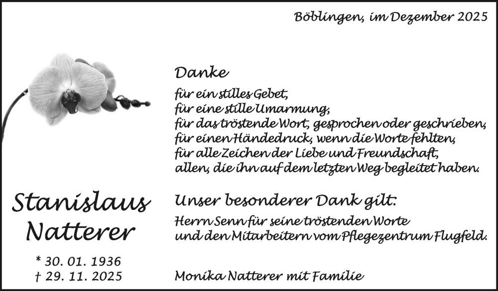 Hier finden Sie alle Traueranzeigen aus der Zeitung, die bisher für Stanislaus Natterer erschienen sind. Weitere Traueranzeigen, die in der Zeitung erscheinen, werden hier ebenfalls aufgelistet