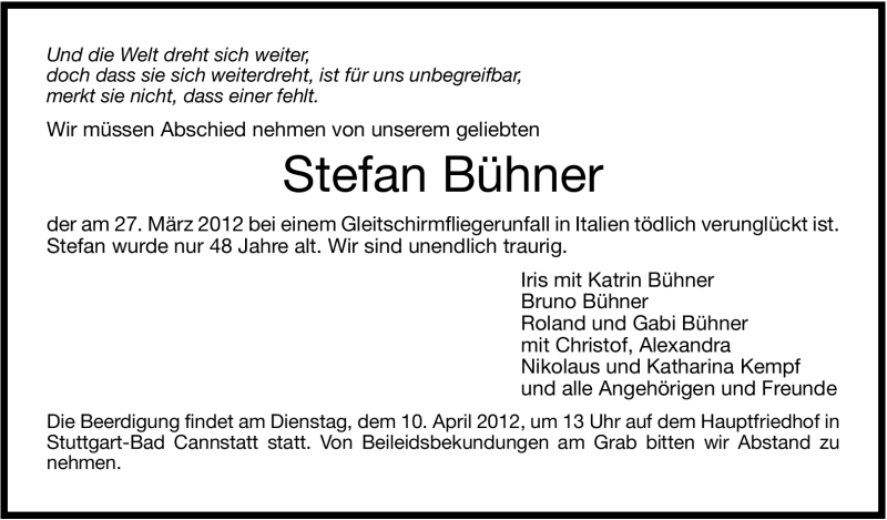 Hier finden Sie alle Traueranzeigen aus der Zeitung, die bisher für Stefan Bühner erschienen sind. Weitere Traueranzeigen, die in der Zeitung erscheinen, werden hier ebenfalls aufgelistet